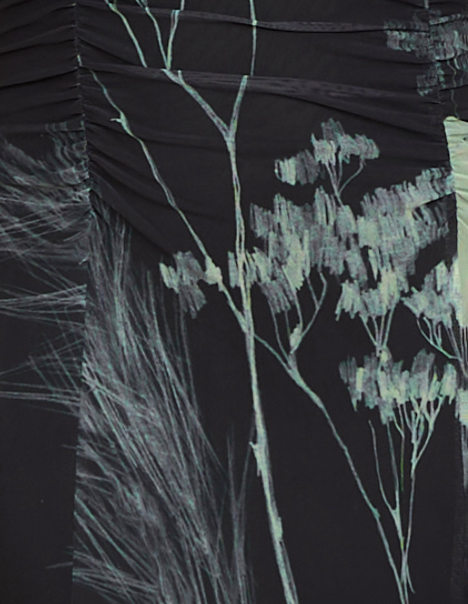 - Printed mesh fabrication with stretch; abstract floral print on a black base
