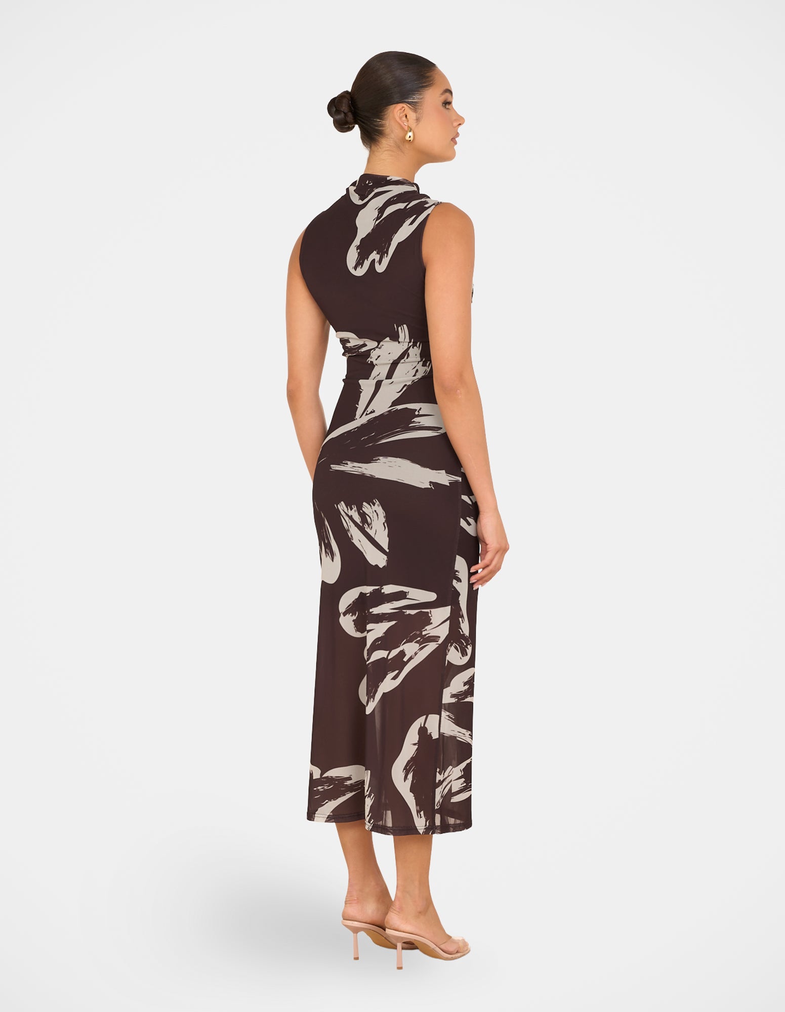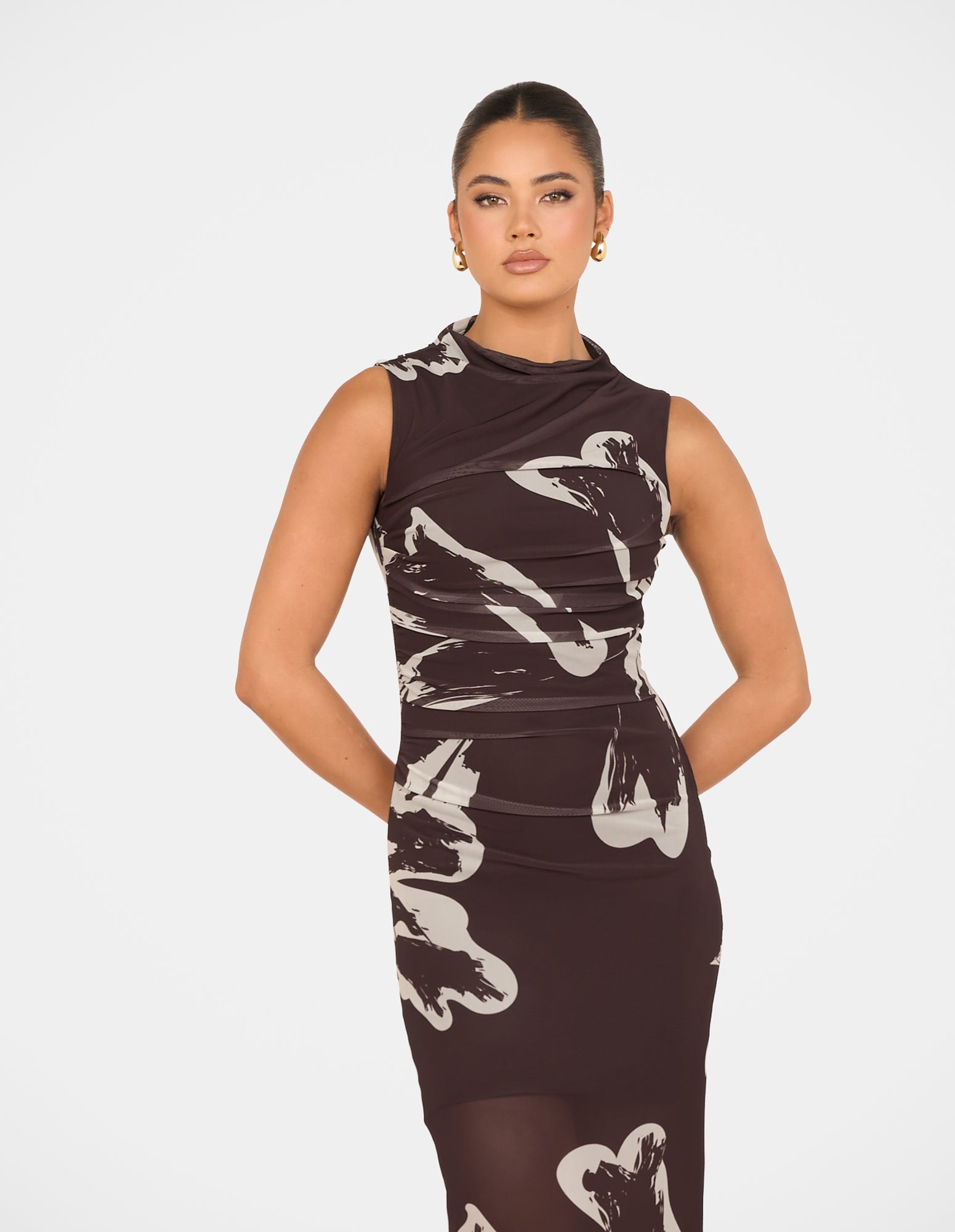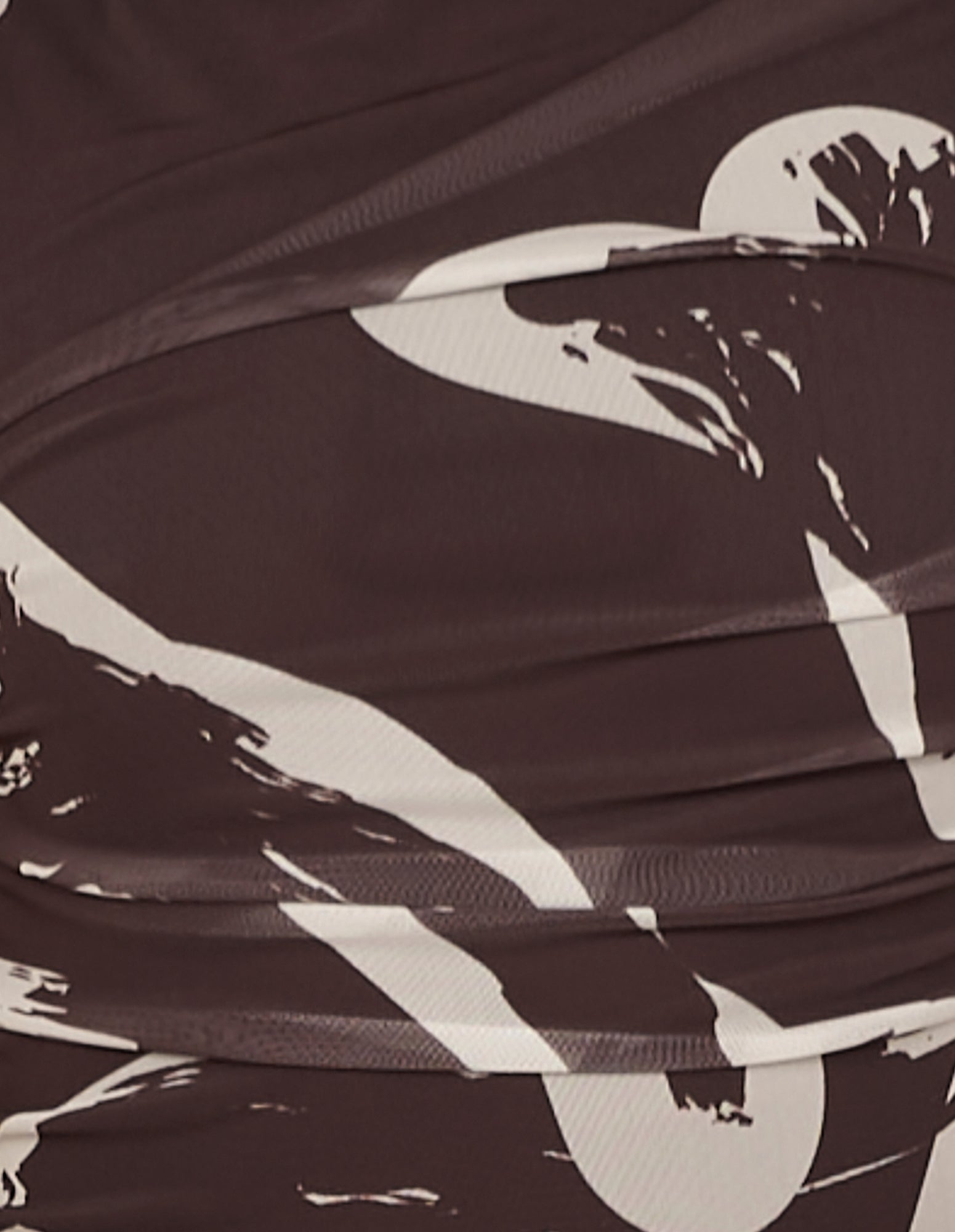 - Mesh fabrication with high stretch; abstract floral print on a brown base