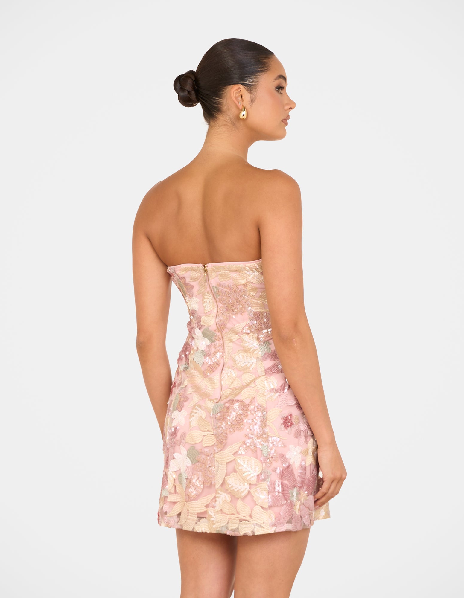 - Floral sequin applique overlay; pink base fabrication with slight stretch