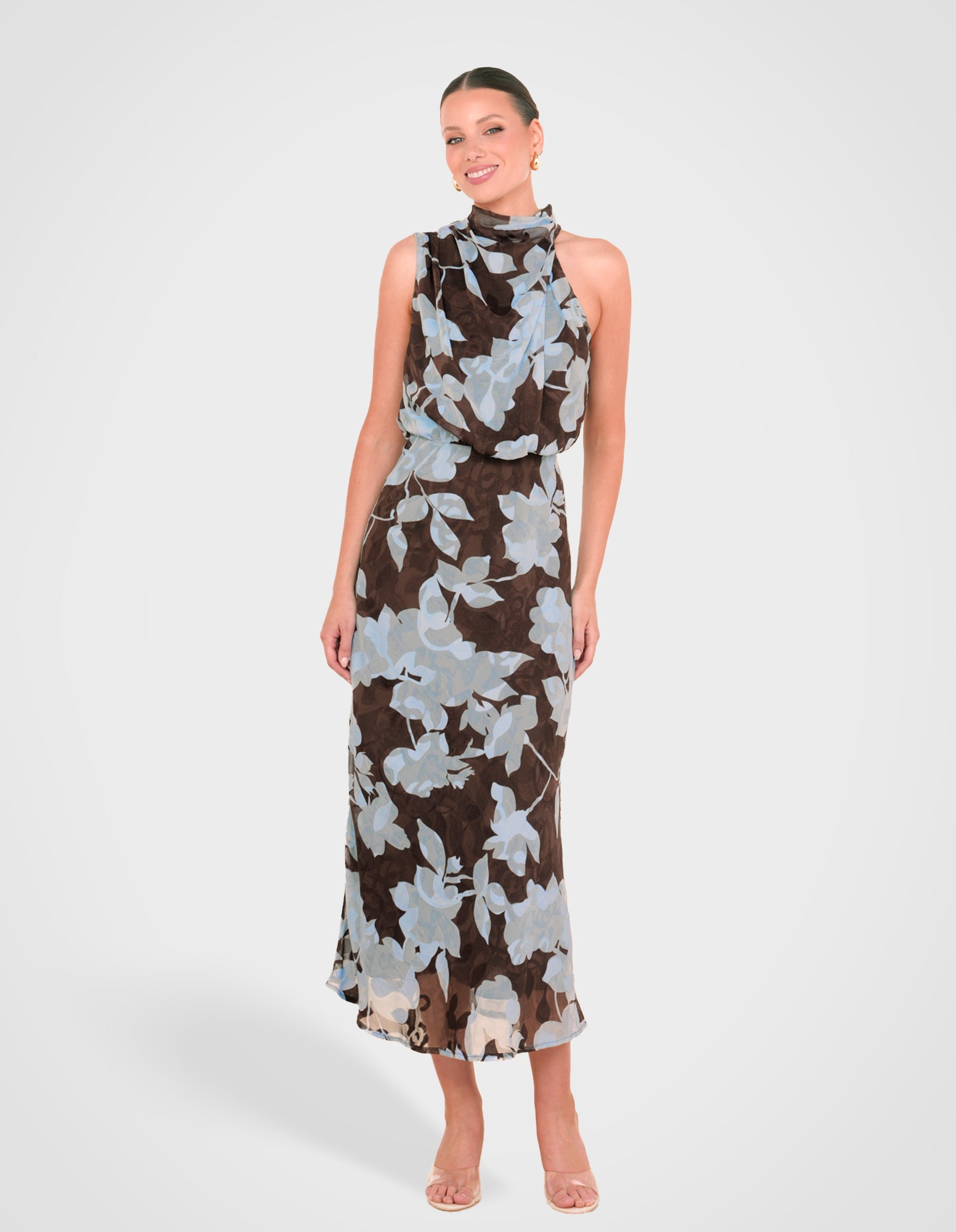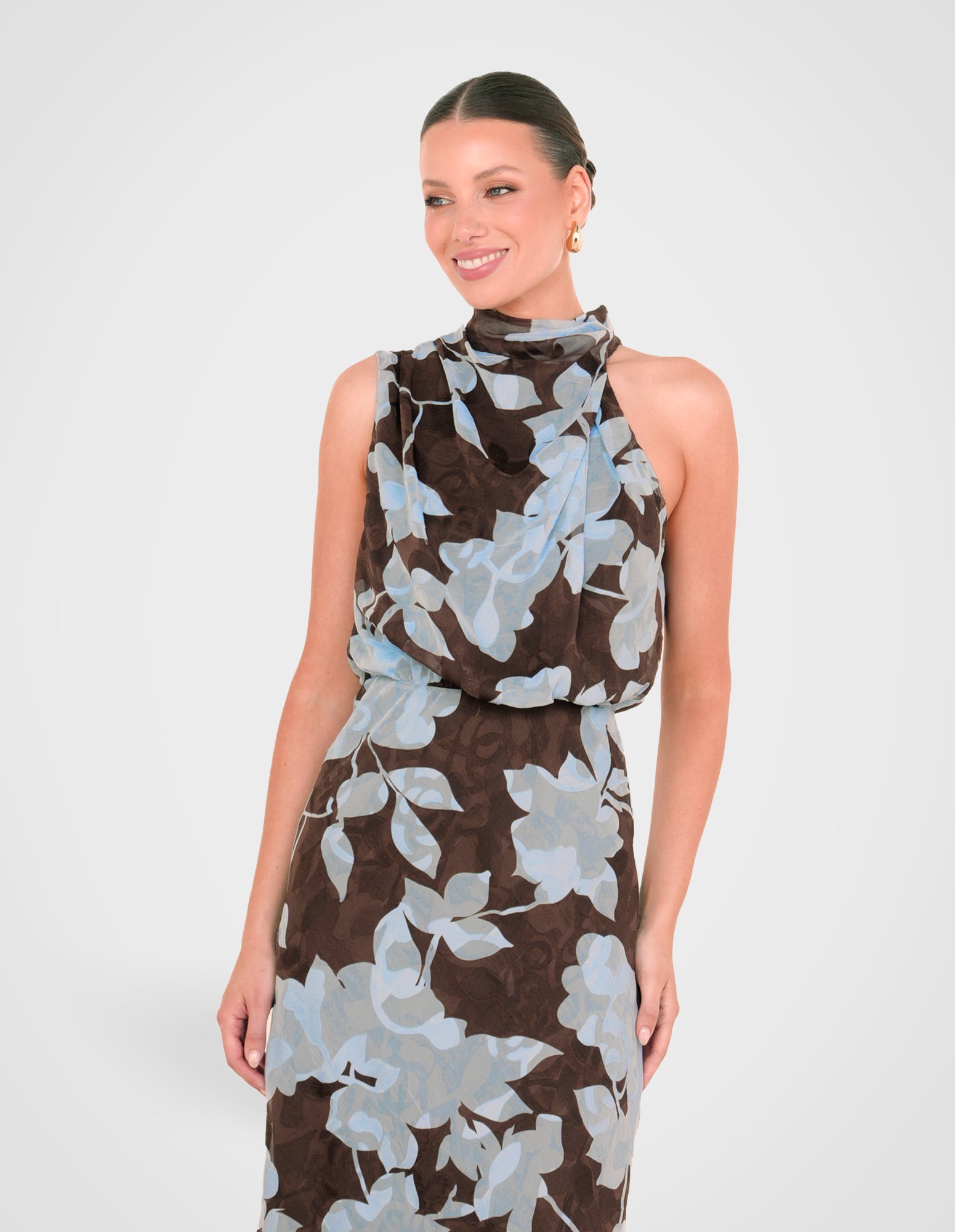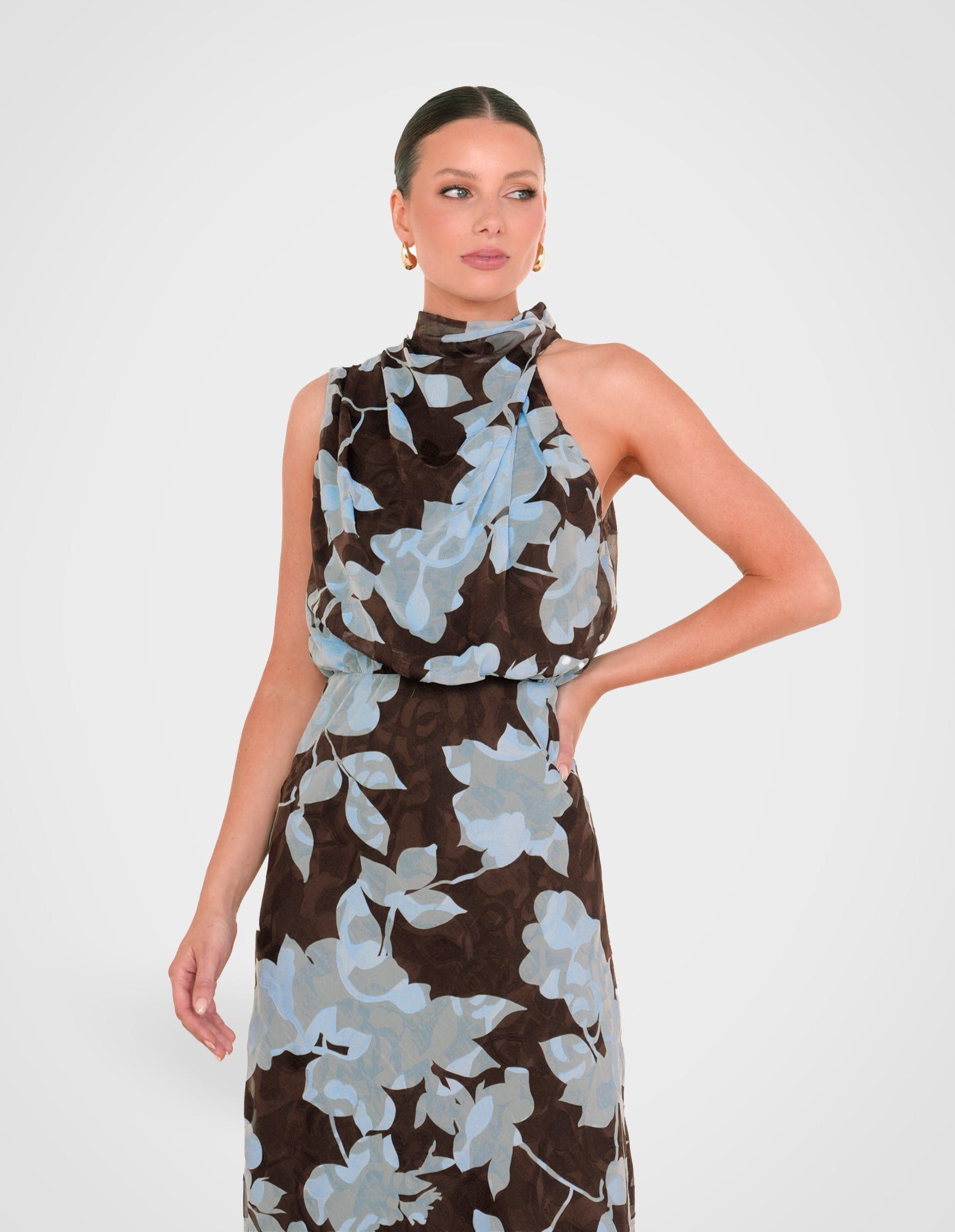 - Length: 128.4cm (size AU 8)- Printed chiffon overlay fabrication; blue jacquard print on a brown base