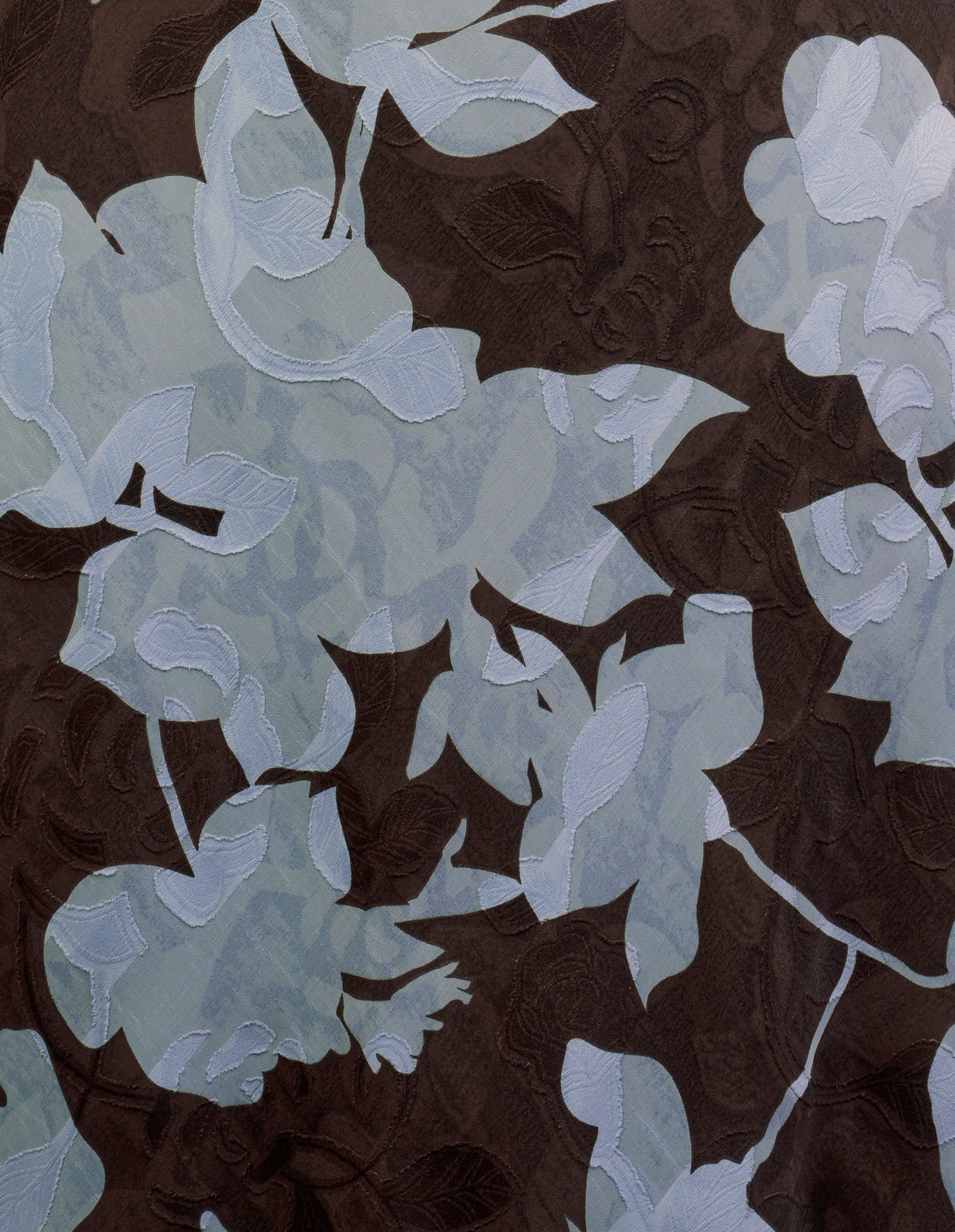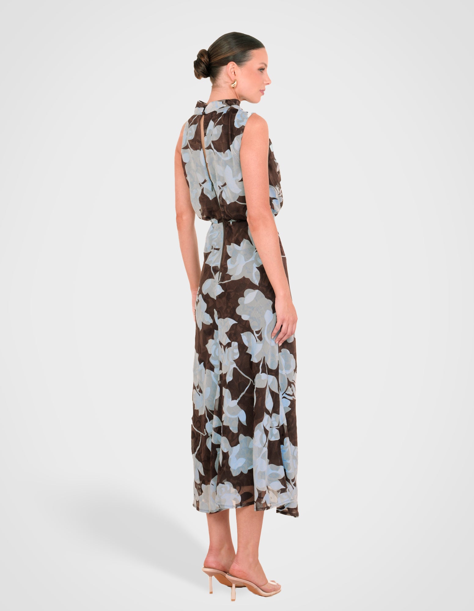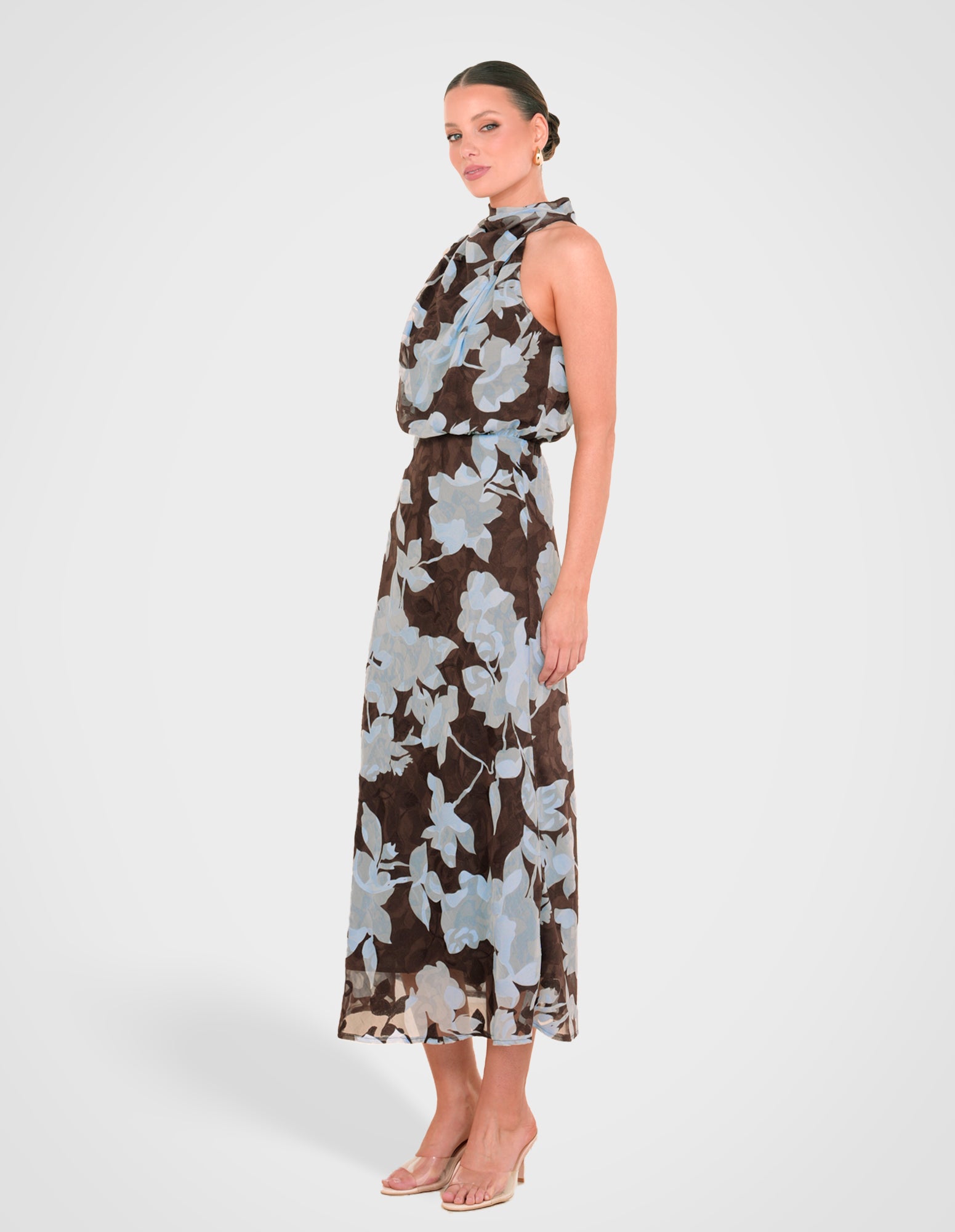 - Length: 128.4cm (size AU 8)- Printed chiffon overlay fabrication; blue jacquard print on a brown base